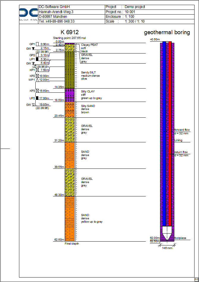 The DCBORE program can be used to represent borehole profiles as well as well lining and gauge instrumentation according to relevant standards and create layer specifications (bore logs). Furthermore, in combination with the add-on options, the program allows the representation of standard penetration tests (SPT) and the determination of the extraction rate of borehole heat exchangers.
